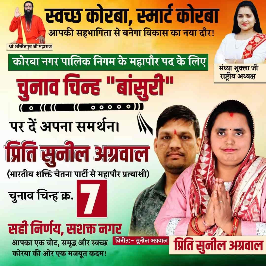 भारतीय शक्ति चेतना पार्टी की महापौर प्रत्याशी प्रीति सुनील अग्रवाल ने बताया कि भाजपा और कांग्रेस पार्टी के नाराज कार्यकर्ता और मतदाता उनका खुलकर समर्थन कर रहे हैं और उन्हें जीताने के लिए तन मन धन से सहयोग कर रहे हैं ।