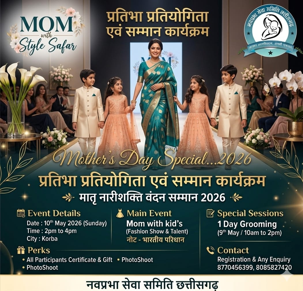 ● कोरबा में मातृ शक्ति का महोत्सव: “मातृ नारिशक्ति वंदन सम्मान 2026” एवं “Queen of Chhattisgarh Season-3” का भव्य आयोजन 10 मई को नवप्रभा सेवा समिति छत्तीसगढ के द्वारा आयोजित किया जा रहा।