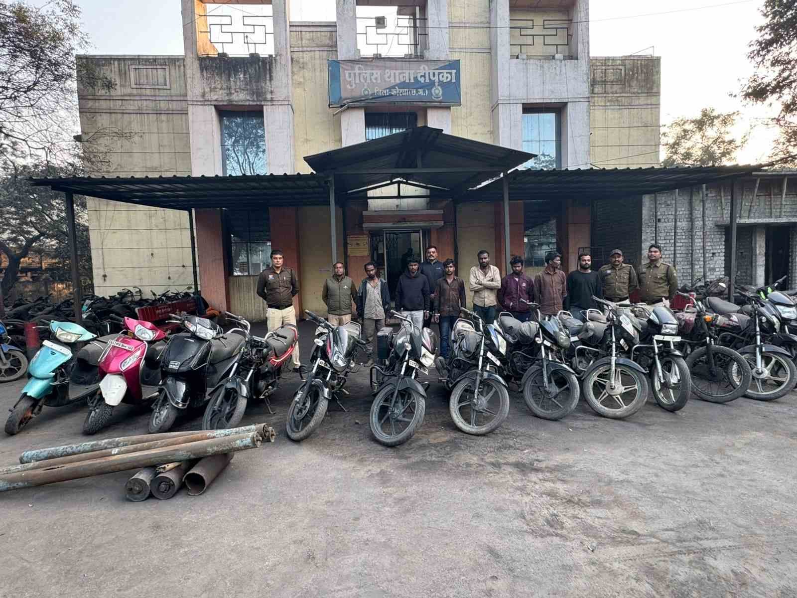 प्रार्थी मोहम्मद असलम द्वारा रिपोर्ट दर्ज कराया गया था कि दीपिका SECL खदान से रोलर को अज्ञात व्यक्ति द्वारा चोरी किया गया है उक्त रिपोर्ट में थाना दीपिका में अपराध पंजीबद्ध कर आरोपी के पताशाजी के दौरान मूखबीर सूचना के आधार पर संदेही जय सिंह पटेल को पकड़ा गया, आरोपी से पूछताछ के दौरान अपने अन्य साथियों के साथ मिलकर एसईसीएल दीपका खदान से रोलर की चोरी के साथ-साथ दीपका थाना, कुसमुंडा थाना एवं सर्वमंगला चौकी क्षेत्र से मोटरसाइकिल की चोरी करना स्वीकार किया और आरोपी के मेमोरेंडम के आधार पर उपरोक्त 14 मोटरसाइकिल को बरामद कर जप्त किया गया है. आरोपियों द्वारा अपराध स्वीकार करने पर उपरोक्त 7 आरोपियों को गिरफ्तार कर न्यायिक हिरासत मे भेजा गया है।