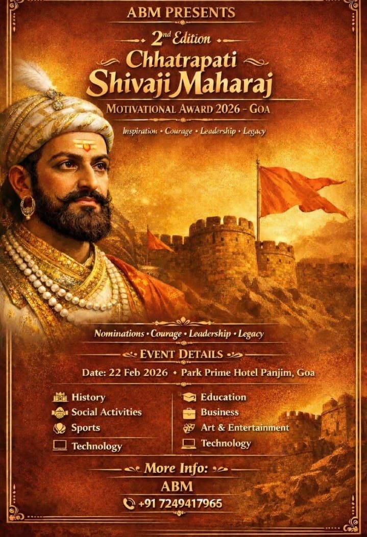 मुम्बई/स्वराज टुडे: एबीएम के बैनर तले पणजी, गोवा स्थित पार्क प्राइम होटल के प्रेक्षागृह में 22 फरवरी को छत्रपति शिवाजी महाराज मोटिवेशनल अवॉर्ड 2026 समारोह ( द्वितीय संस्करण ) आयोजित किया जाएगा। छत्रपति शिवाजी महाराज के आदर्शों से प्रेरित होकर प्रेरणा, साहस, नेतृत्व और विरासत को समर्पित इस भव्य पुरस्कार समारोह के आयोजन का मुख्य उद्देश्य समाज के विभिन्न क्षेत्रों में उत्कृष्ट योगदान देने वाले व्यक्तियों और संस्थाओं को सम्मानित करना है, जिन्होंने अपने समर्पण, नवाचार और उत्कृष्टता से समाज को नई दिशा दी है। इतिहास एवं विरासत, शिक्षा, सामाजिक गतिविधियाँ व्यवसाय एवं उद्यमिता,खेल, कला एवं मनोरंजन के साथ साथ प्रौद्योगिकी के क्षेत्र में उल्लेखनीय योगदान देने वाले शख्सियतों को इस पुरस्कार समारोह में अवार्ड दे कर सम्मानित किया जाएगा। इस प्रतिष्ठित पुरस्कार हेतु नामांकन प्रक्रिया प्रारंभ हो चुकी है।
