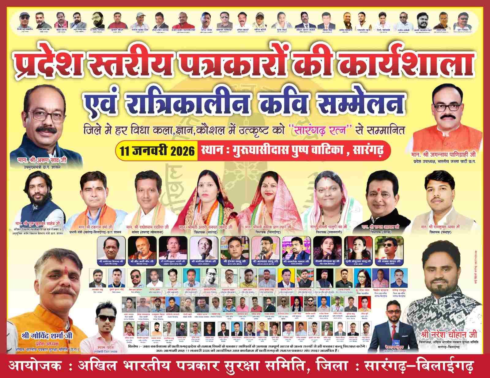 सारंगढ़–बिलाईगढ़/स्वराज टुडे: सारंगढ़–बिलाईगढ़ जिले के इतिहास में 11 जनवरी का दिन एक नई पहचान गढ़ने जा रहा है। जिले के प्रतिष्ठित गुरु घासीदास पुष्पबाटिका परिसर में आयोजित होने वाली प्रदेश स्तरीय पत्रकार कार्यशाला, भव्य रात्रिकालीन कवि सम्मेलन एवं “सारंगढ़ रत्न” सम्मान समारोह न केवल पत्रकारिता और साहित्य का उत्सव बनेगा, बल्कि समाज के विभिन्न क्षेत्रों में उत्कृष्ट योगदान देने वाले व्यक्तित्वों के सम्मान का ऐतिहासिक मंच भी साबित होगा। आयोजन को लेकर पूरे जिले और आसपास के क्षेत्रों में अभूतपूर्व उत्साह एवं ऊर्जा का माहौल है।