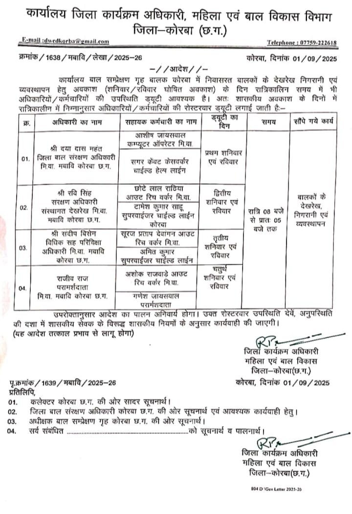 महिला एवं बाल विकास विभाग, कोरबा की DPO रेणु प्रकाश द्वारा जारी आदेश के मुताबिक जिला बाल संरक्षण इकाई के प्रमुख दयादास महंत के अलावा रवि सिंह, संदीप बिसेन और राजीव राज के अधीन अन्य 8 कर्मचारियों की ड्यूटी बाल संप्रेक्षण गृह में लगाई गई है, जो शनिवार और रविवार को होने वाली छुट्टी के दिन संप्रेक्षण गृह में रात के वक्त रहेंगे और बालकों की देखरेख, निगरानी और व्यवस्थापन करेंगे। विशेष तौर पर उल्लेख है कि अवकाश के दिनों में रात्रिकालीन ड्यूटी देनी है, अर्थात रात्रि जागरण करें और बच्चों की निगरानी करें।
