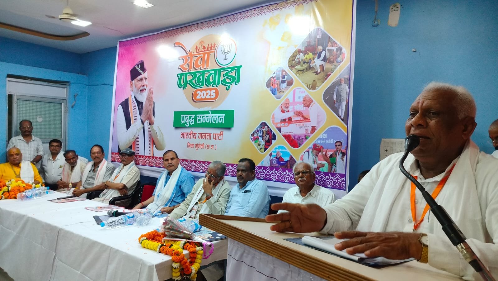 प्रधानमंत्री नरेंद्र मोदी के जन्मदिवस से प्रारंभ सेवा पखवाड़ा के तहत प्रबुद्ध जन सम्मेलन झूलेलाल धाम स्थित सभागार में किया गया। इस अवसर पर मुख्य वक्ता के रूप में उपस्थित छग विधानसभा के पूर्व अध्यक्ष एवं बिल्हा विधायक धरमलाल कौशिक ने कहा कि प्रधानमंत्री के रूप में नरेंद्र मोदी जी के आने से देश के लोगों के जीवन में परिवर्तन आया है,लोगों का सरकार के प्रति भरोसा बढ़ा है क्योंकि मोदी जी ने भारत के स्वाभिमान को बढ़ाया है। उनके द्वारा किए गए स्वच्छता अभियान के तहत कार्य व 12 करोड़ से अधिक शौचालय निर्माण,प्रधानमंत्री आवास निर्माण, जनधन खाता के कारण शासन की योजनाओं का सीधा लाभ उनके खाते में पहुँच रहा है। किसानों को सम्मान मिल रहा है।