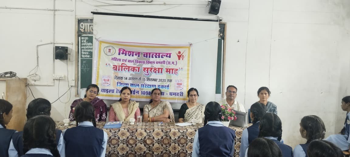 धमतरी/स्वराज टुडे: जिला धमतरी महिला बाल विकास विभाग एवं चाईल्ड हेल्पलाइन द्वारा 14 अगस्त से 15 सितंबर 25 तक बालिका सुरक्षा माह चलाया जा रहा है जिसके अंतर्गत जागरूकता अभियान चलाकर बालिकाओं को किया जा रहा सजग “Safeguarding the Girl Child : Towards a safer and enabling environment for her in India”विषय पर आज दिनांक 15.09.25 को स्वामी आत्मानंद इंग्लिश मीडियम स्कूल गवर्नमेंट हायर सेकेंडरी स्कूल गोकुलपुर धमतरी मे कलेक्टर अविनाश मिश्रा के निर्देश एवं श्रीमती जगरानी एक्का जिला कार्यक्रम अधिकारी महिला बाल विकास धमतरी तथा श्री महेश मरकाम जिला महिला बाल विकास अधिकारी के आदेशानुसार एवं श्री आनंद पाठक जिला बाल संरक्षण अधिकारी, महिला बाल विकास विभाग एवं चाईल्ड हेल्पलाइन के द्वारा बालिका सुरक्षा माह कार्यक्रम का आयोजन किया गया।