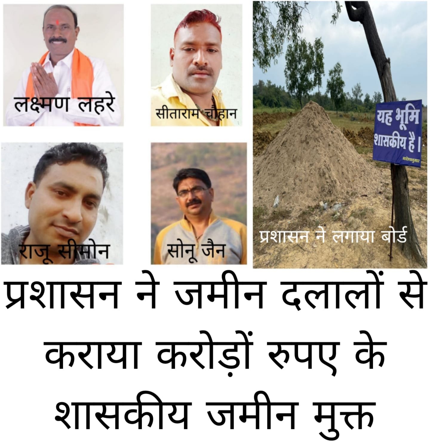 जिले के नगर निगम क्षेत्र में भूमाफिया लक्ष्मण लहरे, सीताराम चौहान, राजू सिमोन और सोनू जैन के द्वारा सांठ गांठ दर्जनों शासकीय भूमि का अतिक्रमण लोगों ने किया है। ये सिलसिला इलाके में अब भी जारी है। भू माफिया कई भूखंड को फर्जी कागजात के जरिए खरीदी बिक्री करने में भी सफल होते रहे हैं। लेकिन अब सरकारी भूखंडों में विभागी सांकेतिक साइन बोर्ड लग जाने के बाद उसकी खरीद फरोख्त पर रोक लगेगी। आसपास के लोगों को जानकारी मिल जाएगी कि संबंधित भूखंड सरकारी है। कोई भी व्यक्ति इसे अवैध कब्जा नहीं कर सकता है। अगर किसी व्यक्ति के द्वारा भूखंड का क्रय विक्रय करने का प्रयास किए जाने की स्थिति में सम्बंधित व्यक्ति पर विधि सम्मत कार्रवाई की जाएगी।