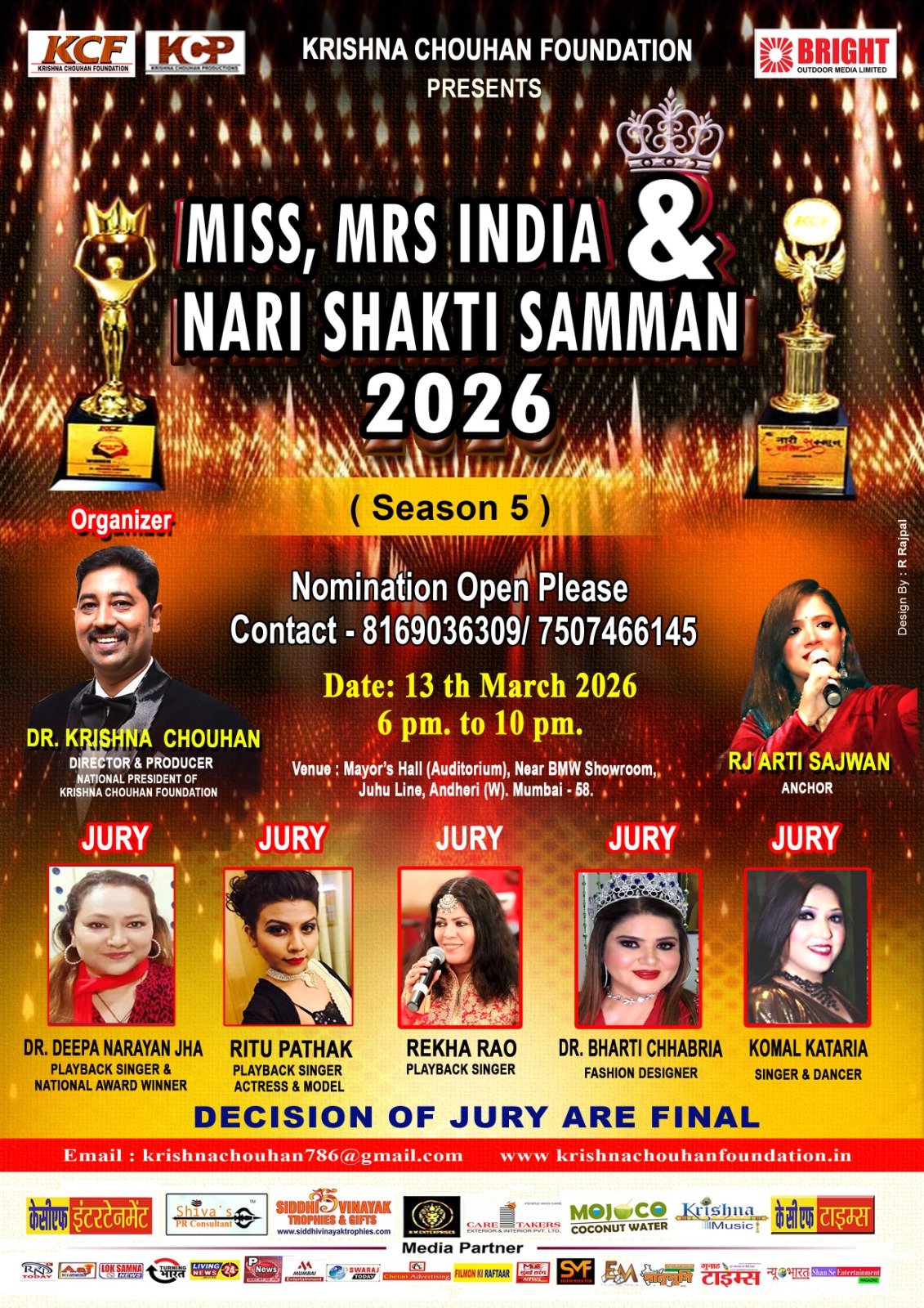 मुम्बई/स्वराज टुडे: मायानगरी मुम्बई में अवार्ड फंक्शन के किंग कहे जाने वाले डॉ कृष्णा चौहान महिला दिवस के उपलक्ष्य पर ‘मिस एंड मिसेज इंडिया 2026 और नारी शक्ति सम्मान 2026’ के 5वें सीज़न का भव्य आयोजन 13 मार्च को महानगर के प्रसिद्ध उपनगर अंधेरी पश्चिम स्थित मेयर हॉल में करने जा रहे हैं। केसीएफ प्रस्तुत इस पुरस्कार समारोह में उनको सम्मानित किया जाएगा जिन्होंने समाज सेवा और मानव सेवा का उल्लेखनीय कार्य किया है। साथ ही अपनी कला और व्यक्तित्व का उत्कृष्ट प्रदर्शन करते हुए समाज को नई दिशा प्रदान की हैं।