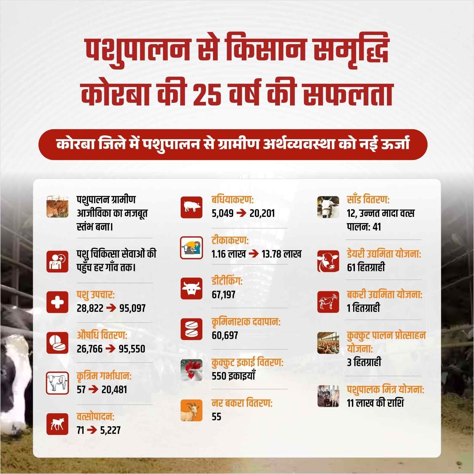 पशुपालन से जुड़ी गतिविधियाँ जैसे दुग्ध उत्पादन, डेयरी प्रसंस्करण और गोबर से जैविक खाद या बायोगैस निर्माण, ग्रामीण अर्थव्यवस्था को स्थायित्व दे रही हैं। इससे किसानों को सालभर आय के अवसर मिल रहे हैं और रोजगार के नए रास्ते खुल रहे हैं। खेत में मेहनत करने वाले हाथों तभी सशक्त बनते हैं जब उनके पास स्वस्थ और उत्पादक मवेशी हो, इसी सोच को साकार करते हुए कोरबा जिले के पशु चिकित्सा सेवाएँ विभाग ने पिछले 25 वर्षों (2000 से 2025) में ऐसी उपलब्धियाँ हासिल की हैं, जिन्होंने न केवल पशुपालन की दिशा बदली बल्कि किसानों की आय बढ़ाने में भी अहम भूमिका निभाई। पशु चिकित्सा सेवाओं विभाग ने योजनाओं के माध्यम से न केवल पशुओं का उपचार किया बल्कि किसानों के जीवन में नई ऊर्जा का संचार किया है।