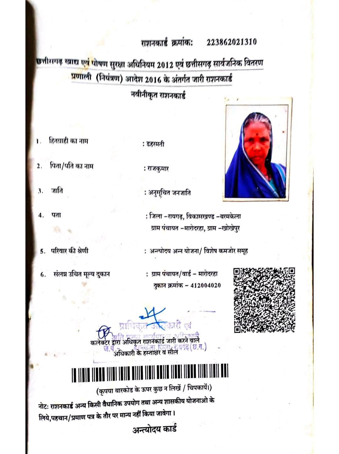 मृतिका के निधन के दो साल बाद भी राशन कार्ड पर जारी रहा घोटाला , कलेक्टर जनदर्शन में हुई लिखित शिकायत ।