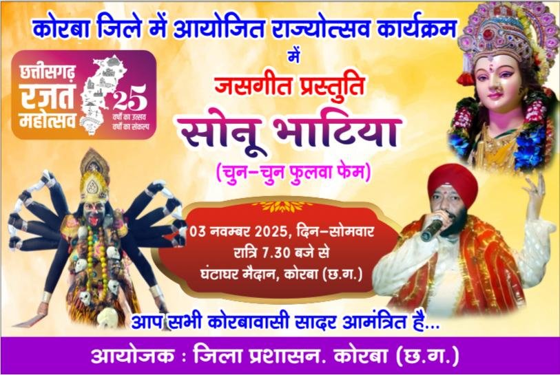 कोरबा/स्वराज टुडे: छत्तीसगढ़ राज्य के स्थापना दिवस की 25वीं वर्षगांठ के अवसर पर जिला प्रशासन कोरबा द्वारा भव्य राज्योत्सव महोत्सव का आयोजन किया जा रहा है। तीन दिवसीय इस राज्योत्सव कार्यक्रम के अंतर्गत 3 नवंबर सोमवार की रात्रि 7:30 बजे से घंटाघर मैदान में सुप्रसिद्ध जसगीत गायक सोनू भाटिया (चुन-चुन फुलवा फेम) अपनी जसगीत प्रस्तुति से श्रद्धा और भक्ति का अद्भुत संचार करेंगे।