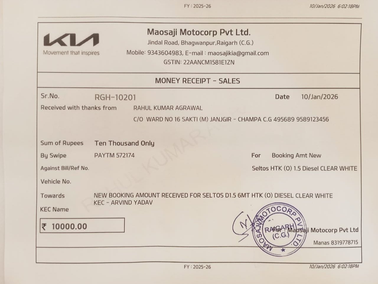 प्राप्त जानकारी के अनुसार, दिनांक 10 जनवरी को Kia Seltos HTK (O) मॉडल वाहन की बुकिंग हेतु ₹10,000 की टोकन राशि Kia शोरूम रायगढ़ के खाते में जमा की गई, जिसकी रसीद पीड़ित पत्रकार राहुल अग्रवाल के पास सुरक्षित है। इसके बाद 23 जनवरी को बैंक ऑफ बड़ौदा, सक्ती शाखा से वाहन के लिए डीओ (डिलीवरी ऑर्डर) लेटर भी जारी करवा दिया गया, जिसकी प्रति भी उपलब्ध है।