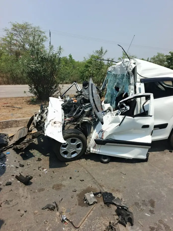 कार में कुल छह लोग सवार थे। वाहन पहले सड़क के डिवाइडर से टकराया, फिर अनियंत्रित होकर पलट गया और सड़क किनारे खड़ी हाइवा से जा टकराया। टक्कर इतनी भीषण थी कि कार के परखच्चे उड़ गए और घटनास्थल पर चीख-पुकार मच गई। बताया जा रहा है कि कार चालक को नींद की झपकी आ जाने के चलते यह घटना घटी है ।