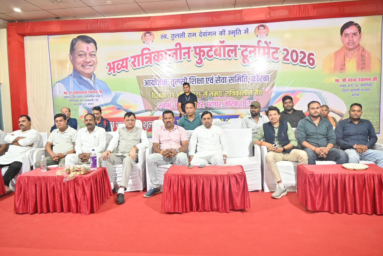 कोरबा/स्वराज टुडे: स्वर्गीय तुलसीराम देवांगन जी की पावन स्मृति में आयोजित रात्रिकालीन राज्य स्तरीय फुटबॉल प्रतियोगिता ने जिले में खेल भावना और प्रतिभा को नई ऊर्जा प्रदान की। 13 अप्रैल 2026 से प्रारंभ इस भव्य प्रतियोगिता का शुभारंभ छत्तीसगढ़ शासन के कैबिनेट मंत्री (उद्योग,श्रम,वाणिज्य,सार्वजनिक उपक्रम,आबकारी) मा.श्री लखनलाल देवांगन जी के करकमलों से हुआ। इस अवसर पर कोरबा नगर निगम की महापौर संजू देवी सिंह राजपूत, जनप्रतिनिधिगण एवं गणमान्य नागरिकों की गरिमामयी उपस्थिति रही।