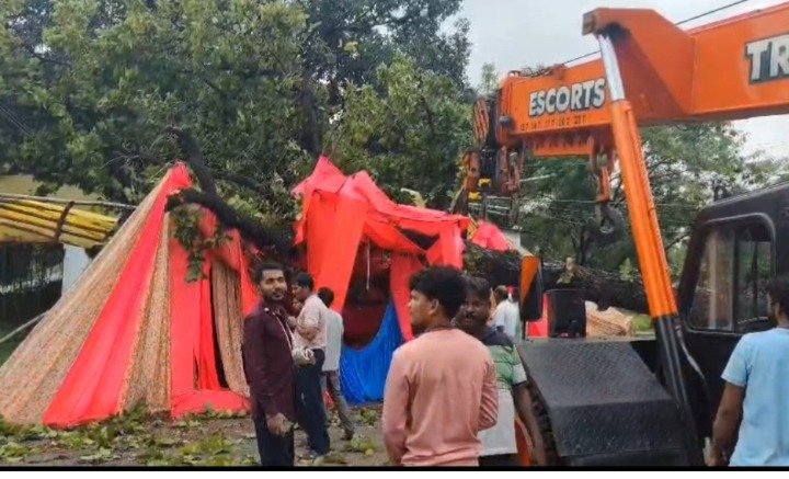चमत्कार: मूसलाधार बारिश के चलते गणेश पंडाल पर गिरा विशालकाय पेड़, गणेश की प्रतिमा और पंडाल में सो रहे बच्चे पूरी तरह सुरक्षित